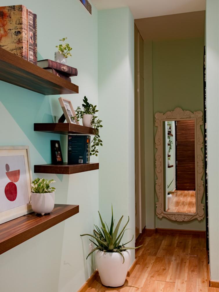 hues of blue and white while the walls are painted in a soft green colour.