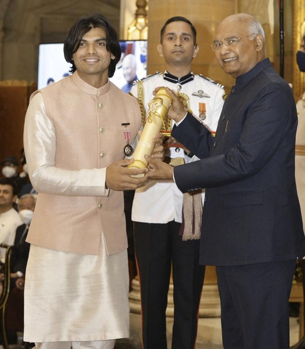 Neeraj Chopra receiving the Padma Shri Award by the then President of India, Ram Nath Kovind in 2022, Daily Excelsior